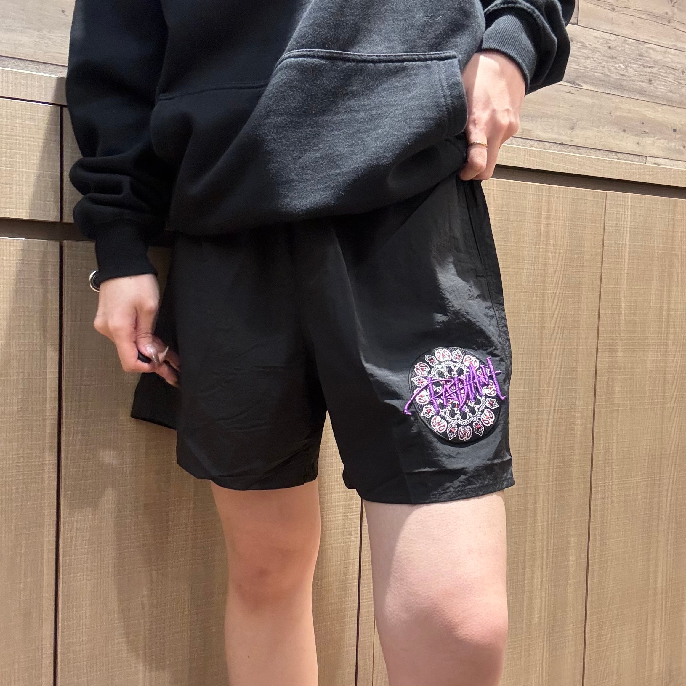 【ハーフパンツ】黒ペイズリー紫ロゴ
